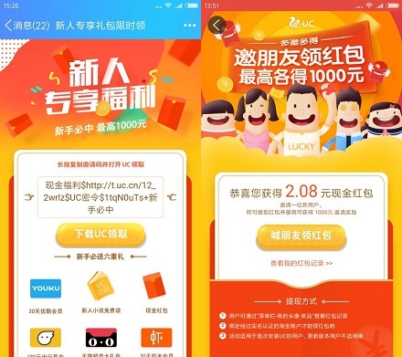 (这个活动失效了,UC极速版的:https://mf927.com/post/5818.html新人也就能提现1元 )