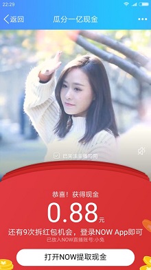 2.进入后,拆开红包,首次一般是0.88元,然后会提示你安装now直播app。