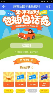 腾讯地图正在举办“年末福利包油包话费”,每天签到可以获得10金币,还有找好友或者给好友助力可以额外获得5金币,最少30金币可抽奖,40金币可以兑换2Q币,120金币兑换10元话费,450金币可以兑换加油卡!