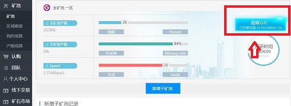 4.点击“矿池”即可看到已经自动开始挖坑了,一个月可以免费挖10个高通币GTC!每天可以提取一次,也就差不多3天能提取到1个高通币了。