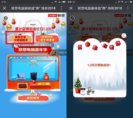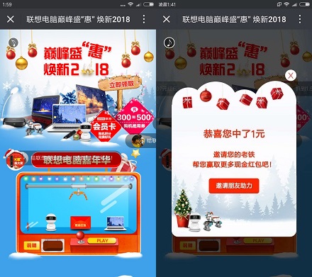 联想电脑的公众号正在举办联想电脑巅峰“惠”焕新2018活动,在活动页面可以抓现金红包,有5次机会,如果不中,随便分享一下,基本都可以抓到1元,秒推微信零钱!