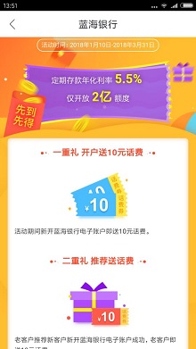 蓝海银行是正经的银行,目前新用户注册为会员后,开通电子账户即可免费获赠10元话费,需要注意的是,开户时需要上传SFZ正反面,还要刷脸。虽然,这个条件苛刻了点,但正因如此,到账的几率反而有所增加了,介意的就做了!