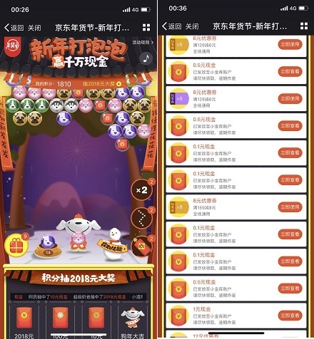 “京东年货节-新年打泡泡”活动正在火热进行中,京东用户可以通过微信或者手机QQ参与,玩小游戏,免费领取现金红包,金额随机,至少有1元以上,最高可抽中2018元,可一直打,亲测弄了几块钱,可直接提现的!