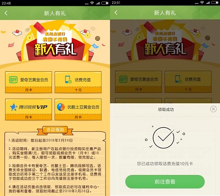 起点银行是苏州银行发起的互联网银行,目前新用户开户(需要上传和刷脸)后,投资购买任意产品(可存1元到钱包,到时可以提现出来),即可获得10元话费或者爱奇艺,优酷土豆,腾讯视频的会员卡月卡!