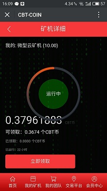 3.认证通过后,会免费赠送一台微型云矿机,自动运行挖坑,在“我的矿机”-“查看详细”-“立即领取”提取收益。