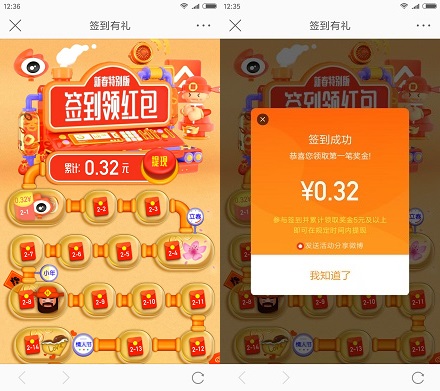 2月刚开始,新浪微博又开始举办新的一期“签到有礼”活动了,活动期间通过微博app每天签到即可随机领取现金红包,一般几毛,累计到5元即可申请提现。差不多有半个月的时间,越早参与,累计到钱越多,最后一天还能抽奖!