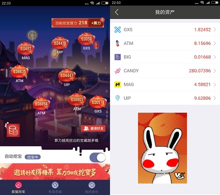 挖坑是自动的,也不用一直挂着,但是收益是需要自己手动领取,如上图,当前可以挖到GXS、ATM、BIG、CANDY、MAG、UIP这6种币了,算力越大挖到的越多,点击右上角“+算力”里面有增加算力的任务。