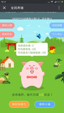 2.每天点击“喂养小猪”可获得1成长值(1元现金),邀请好友助力1次可获得1成长值,每天最多邀请3位。
