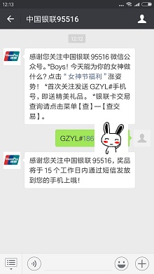 打开微信搜索“中国银联95516”关注公众号,会出现如下提示,回复“GZYL#你自己的手机号”。
