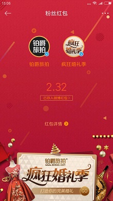 点击抢红包,按提示发一条包含“#疯狂婚礼季#”的微博,不是100%中奖率,只要中了都是0.5元以上!亲测中2.32元。