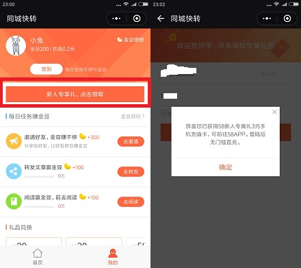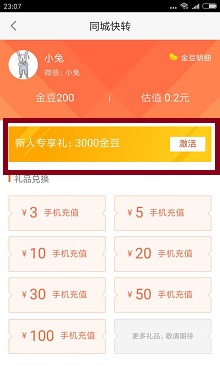 4.自己在各大应用市场搜索“58同城”安装app,然后选择这个微信登录,点击“个人中心”-“我的红包”-“同城快转”先激活领取3000金豆,再兑换3元话费即可。