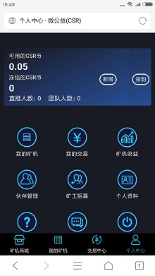 4.在“个人中心”页面,右上角有“签到”,每天签到可免费领取CSR币,金额随机。“新闻”那个可以看到官方公告,推广奖励,交流群等信息。