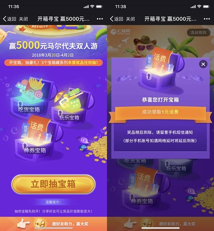 进入后开宝箱,注册为会员,一般都是抽到1元话费,秒到账。
