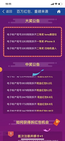 登录后点击“发现”-“百万红包”进入活动页面,当天16:30前注册绑卡拆红包机会将在第二天9:30后更新才能拆,当天16:30后注册绑卡拆红包机会将在第三天9:30后更新才能拆。