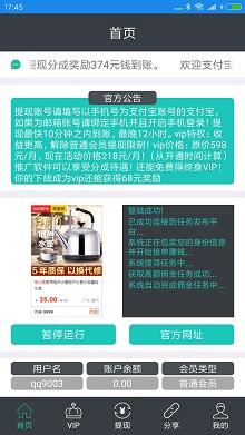 点击“开始运行”挂到0.5元即可申请提现到支付宝,基本秒到,每隔24小时只能提现一次,一次只能0.5元。