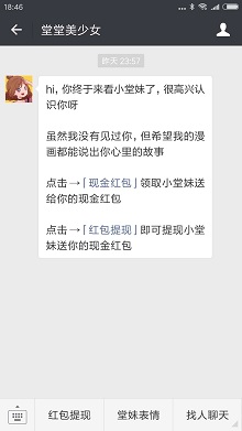 微信搜索关注“堂堂美少女”(微信号:ergenmanhua),先点击上面的“现金红包”,金额随机,一般都是0.2元。再点击下面的“红包提现”填写你支付宝和姓名,秒到账。