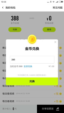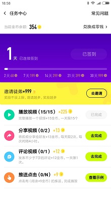 3.其中播放视频任务是重点,每天看15个视频,即可获得225金币,还有签到,分享,评论等。按目前的兑换比例,285金币=1元。