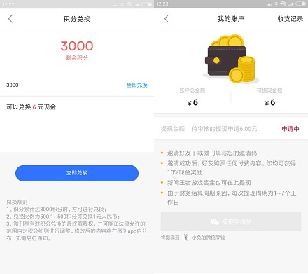 微刊是《Vista看天下政商智库》的官方app,只要针对那些关注时事新闻的人群,看上去比那些标题经常是“震惊”系列的平台要高端。目前注册为会员后,可免费领取6元现金,可直接提现到微信零钱,虽然还没到账,但总感觉比较靠谱!