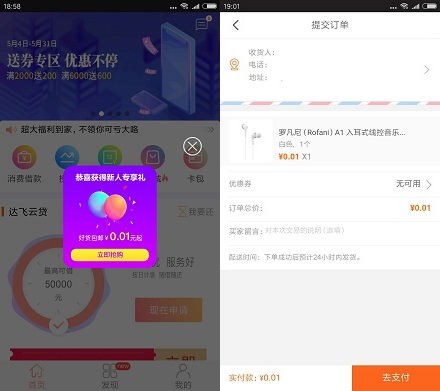 3.登录后,会弹出新人专享礼,进入支付0.01元购买耳机即可。(需要实名认证和绑卡,不用上传,要填银行卡对应预留手机号,提交后1-2元就自动认证成功了。)