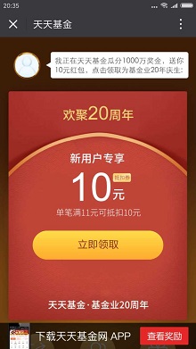 曾几何时,基金的活动是一波接一波,大部分基金平台我都注册了,如今活动也屈指可数了。天天基金正在举办20周年庆活动,这次活动主要针对新用户,注册后赠送10元抵扣券(满11元可用),相当于投资1元活期理财,可赚10元现金!