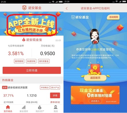 诺安基金本站推荐的比较少,上一次还是破零系列里推荐过的,今天发现举办新的活动,才发现上次的奖励到账了,忘记了提现,这次新老用户也均可参与,亲测抽到了2.68元,奖励到账后,可直接提现到银行卡的!
