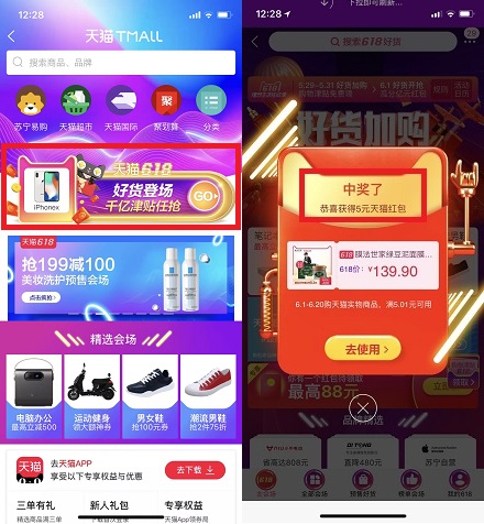 打开手机淘宝,点击“天猫”。(或者直接打开天猫首页),在顶部“好货登场”,进入自动弹出红包,一般可中3-8元红包,也可能中津贴券那个用处不大。