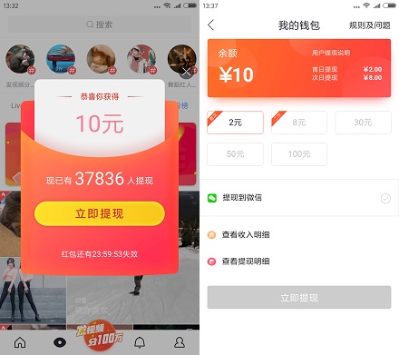 首次的2元可直接提现,还有8元需要次日发视频才行。