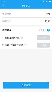 2.登录后,点击“我”-“新人1元提现”完成提现任务(阅读2篇新闻和看下收徒活动)