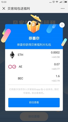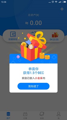2.按提示下载贝客钱包app,登录后,在“资产”页面点击右上角的红色礼盒签到,每隔4个多小时可签到一次,每次1.5个BEC。(当前1BEC在OKEX价值1.3元左右)