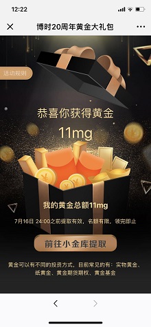 博时基金成立20周年,免费送黄金大礼包,亲测老用户可以免费领取到20mg黄金,按当前的金价,相当于可卖5元以上现金,可直接提现到卡的!新用户同样也可以参与,不过好像没额外新人奖励,做不做看大家自己了。