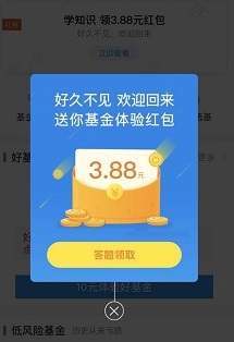 1.打开手机支付宝,在“财富”-“基金”进入后,会自动弹出一个3.88元红包,不弹的多进几次。