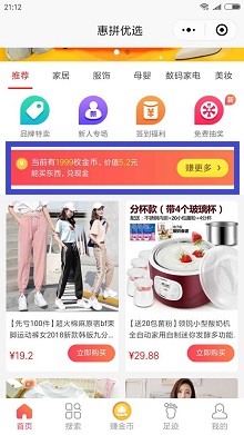 惠拼优选是杭州湘靖网络科技有限公司旗下的电商平台,目前新用户注册后,可免费获得1999惠金币(相当于5.2元人民币),可直接购物抵扣现金,简单的说,你找到5元以下的商品,一分钱都不用花,可直接下单,免费包邮送到家!