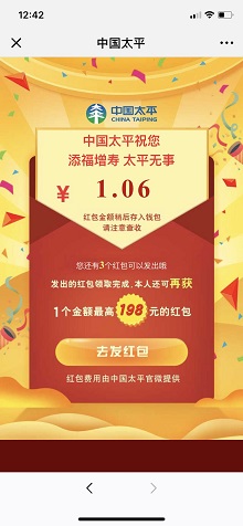 再关注“中国太平”回复这个口令,可免费领取1元以上微信红包,亲测1.06元!