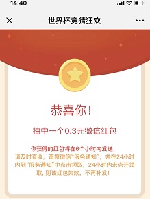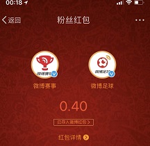 打开微博,点击“发现”上方有“世界杯红包”(还有上微博围观世界杯等活动提示),进入后参与活动,转发或者发条指定话题的微博,即可免费领取红包,金额随机,亲测0.4元。