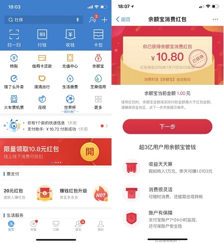 打开支付宝,在首页轮播部分人会看到10.8元红包的提示。