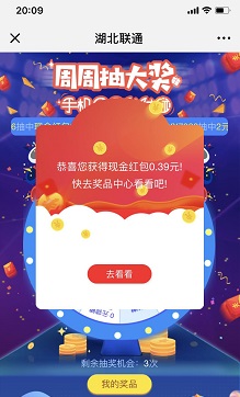 抽中后,记得点进去领取,亲测中0.39元微信红包和2元话费。