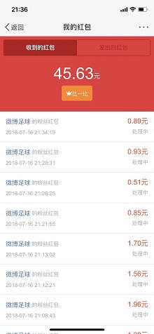 世界杯结束了,百度,淘宝,支付宝,苏宁,UC,马蜂窝,新浪微博等等平台都在比赛期间免费送过红包,尤其是新浪微博到今天还在免费送红包,不知道是我平时经常半夜刷微博,感动了老板,此时此刻一连中了几十个红包,都是1元左右,建议你们也试试看运气吧!