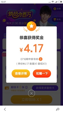 4.每天21:30瓜分百万大奖,每天赠送一个领码机会,完成相应任务可获得更多,你领的码越多,中奖几率越大。
