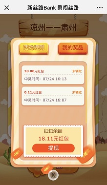 西安银行直销银行正在举办“新丝路bank勇闯丝路”活动,新用户注册为会员后,参与答题可以获得红包奖励,官方规则是在1-2关卡没有使用过复活卡,可获得18元红包奖励,反正我中途也答错过,在实名认证和刷脸后,不知道怎么获得了18.11元,可直接提现!