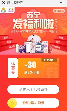 2.输入手机号领取一张满30-30元的优惠券,新用户会收到一条苏宁发来的短信,复制口令并下载app。