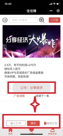 1.微信扫描进入,点击“赚佣金”首次完善下资料,然后开始赚钱,如下图,每个广告下拉找到口令,再输入即可。