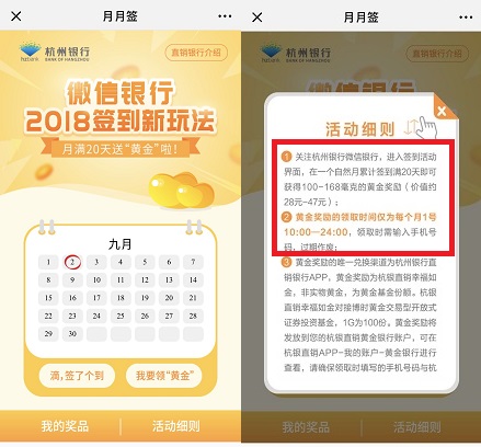 3.在一个月签到累计满20天,即可在次月1号10:00-24:00,去兑换100-168毫克黄金,到时输入你在杭州银行注册的手机号兑换,然后下载杭州银行app,在“我的账户”-“黄金银行”提取卖出。