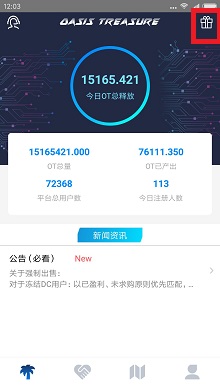 3.在首页点击右上角礼物图标进入,每天分享一次可获得一次抽奖机会,至少可抽中0.1OT。