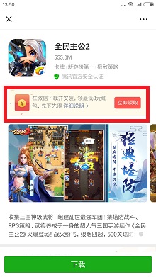 全民主公2是腾讯旗下的手机游戏,当前针对部分新用户有一个下载游戏免费领取8元微信红包的活动,游戏虽然有点大,但这活动实在是简单粗暴,也不用玩,简单登录下即可,秒推8元微信红包!