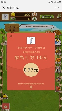 2.这是喜扣游戏平台一个叫“欢乐果园”小游戏,完成引导教程后,会提示红包,需要手机号收个验证码。