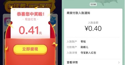 1.微信搜索小程序“刷豆夺宝”,进入后免费红包,按提示参与夺宝,亲测中0.41元,秒到微信零钱!