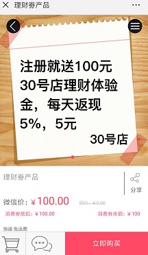 本来准备明天测试完是否能直接提现再推荐这个骗子:30号店,不过又担心到时改了规则,所以还是先推出来,当前注册免费赠送100元体验金,使用后,每天分红5元,最低10元可能提现到支付宝,若不能就放弃!