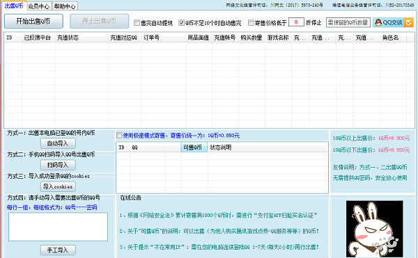 3.左下角有多种登录方式,授权登录后,开始出售Q币,当前售价软件上显示的有10Q币以上(1Q币=0.9元),10Q币以下(1Q币=0.85元)。(价格随时有变动)