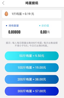 5.鸡蛋的价格有波动,最少50斤起卖,和手持矿机一样,直接出平台(提现到微信零钱),当前1斤鸡蛋=0.19元。
