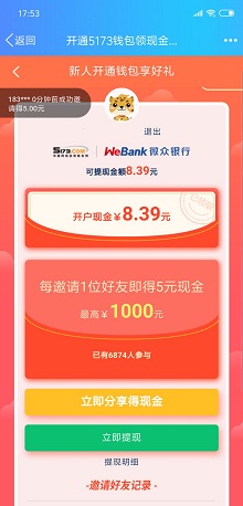 5173是中国网络游戏服务网旗下的网络游戏交易平台,当前联合微众银行搞活动,新用户开通5173钱包后可免费领取8-20元,亲测领到8.39元,充值2元激活后可直接提现,秒到银行卡,微众银行老用户也可参与,邀请一个奖励5元!